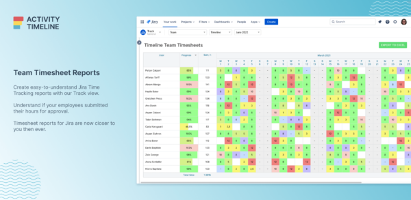 This app allows users to create worklogs, start/stop timers on issues, or use automatic timers based on issue status. Users can also filter and break down timesheets by Jira fields, custom fields, or attributes – and even report on estimated vs actual, overtime work, etc.