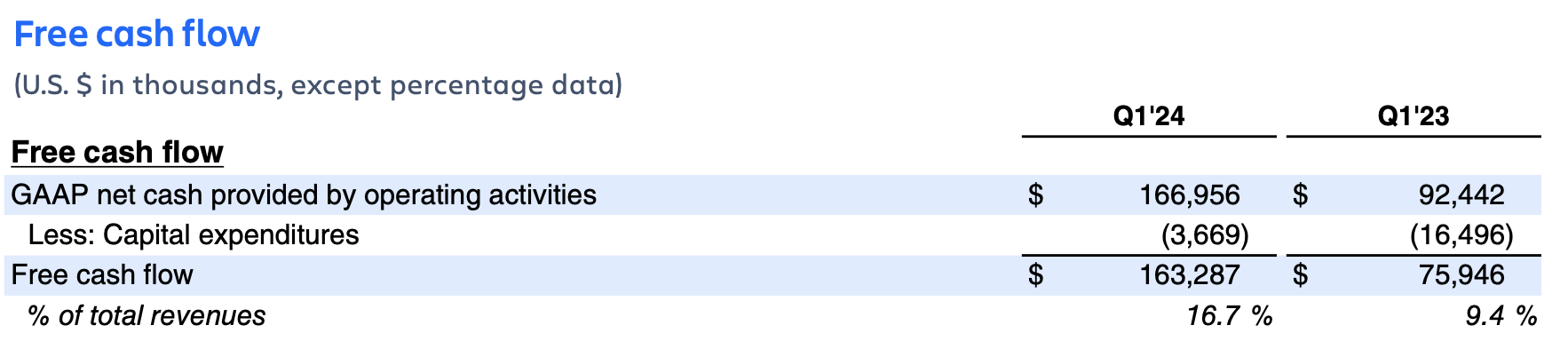 - Operating cash flow of $167 million increased 81% driven by strong collections and lower employee bonus payouts. Free cash flow of $163 million increased 115%.