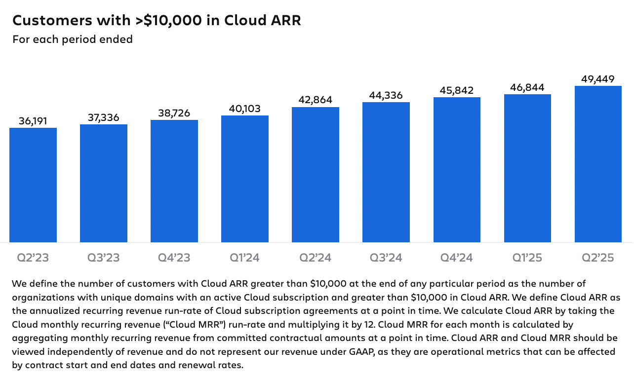 We ended Q2’25 with 49,449 customers with greater than $10,000 in Cloud annualized recurring revenue (Cloud ARR), an increase of 15% year-over-year. We continue to increase scalability across our cloud platform as we delivered support for up to 150,000 users on a single site in Confluence and added support for 100,000 users on a single site in Jira to our public cloud roadmap. Additionally, we have entered the final stage in the process of achieving FedRAMP Moderate, which is another big step in unlocking the Atlassian cloud for many of our largest, most complex customers.