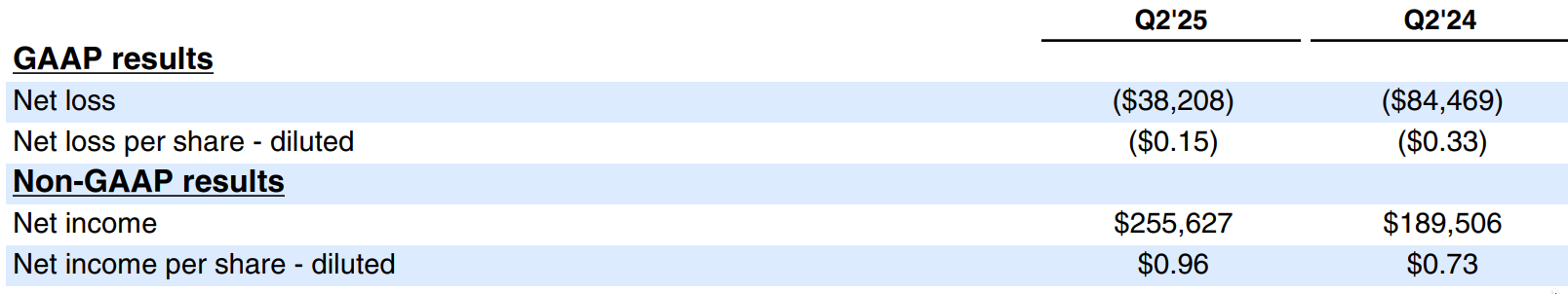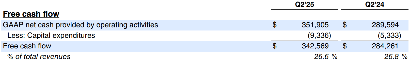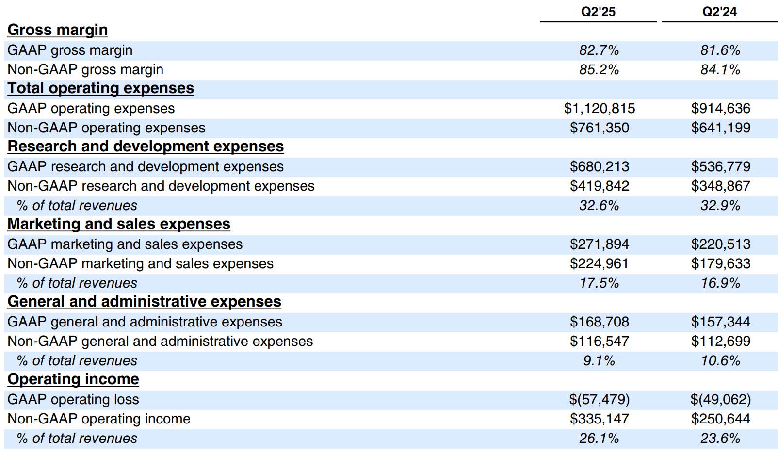 GAAP operating expenses increased 23% year-over-year driven by higher employment costs, including stock-based compensation expenses. Headcount at the end of Q2’25 was 12,750, an increase of 249 from the prior quarter, primarily driven by hiring in sales as we continue to evolve the way we sell to and support our largest enterprise customers.