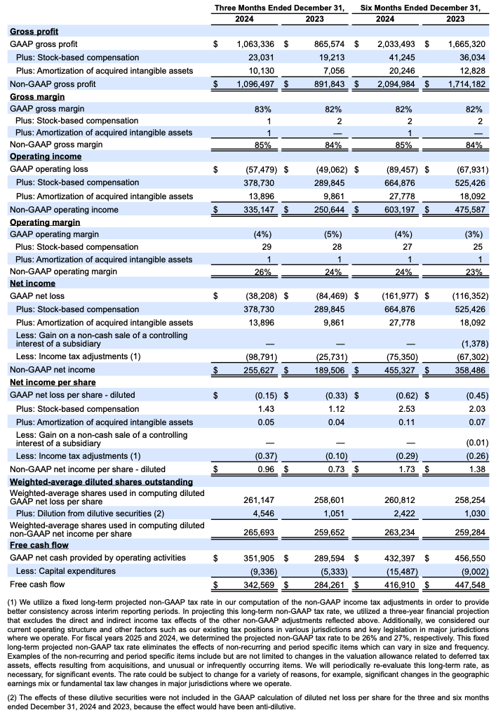 - GAAP operating loss was $57 million, and GAAP operating margin of (4%) was flat. Non-GAAP operating income was $335 million and non-GAAP operating margin of 26% increased two percentage points driven by greater operating leverage and the increase in gross margin.