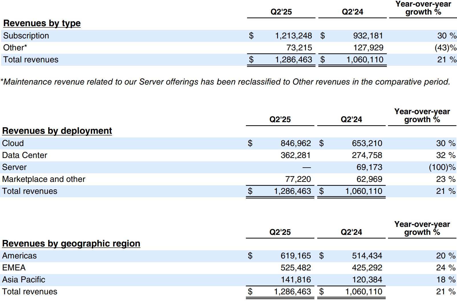 Cloud revenue growth of 30% was driven by paid seat expansion within existing customers, migrations, cross-sell of additional products, and higher average revenue per user (ARPU). Overall, trends in the quarter were consistent with Q1’25. Paid seat expansion and migrations exceeded our expectations, while cross-sell, adoption of higher-value editions, top-of-funnel performance, and customer retention were in line to slightly ahead of our expectations.