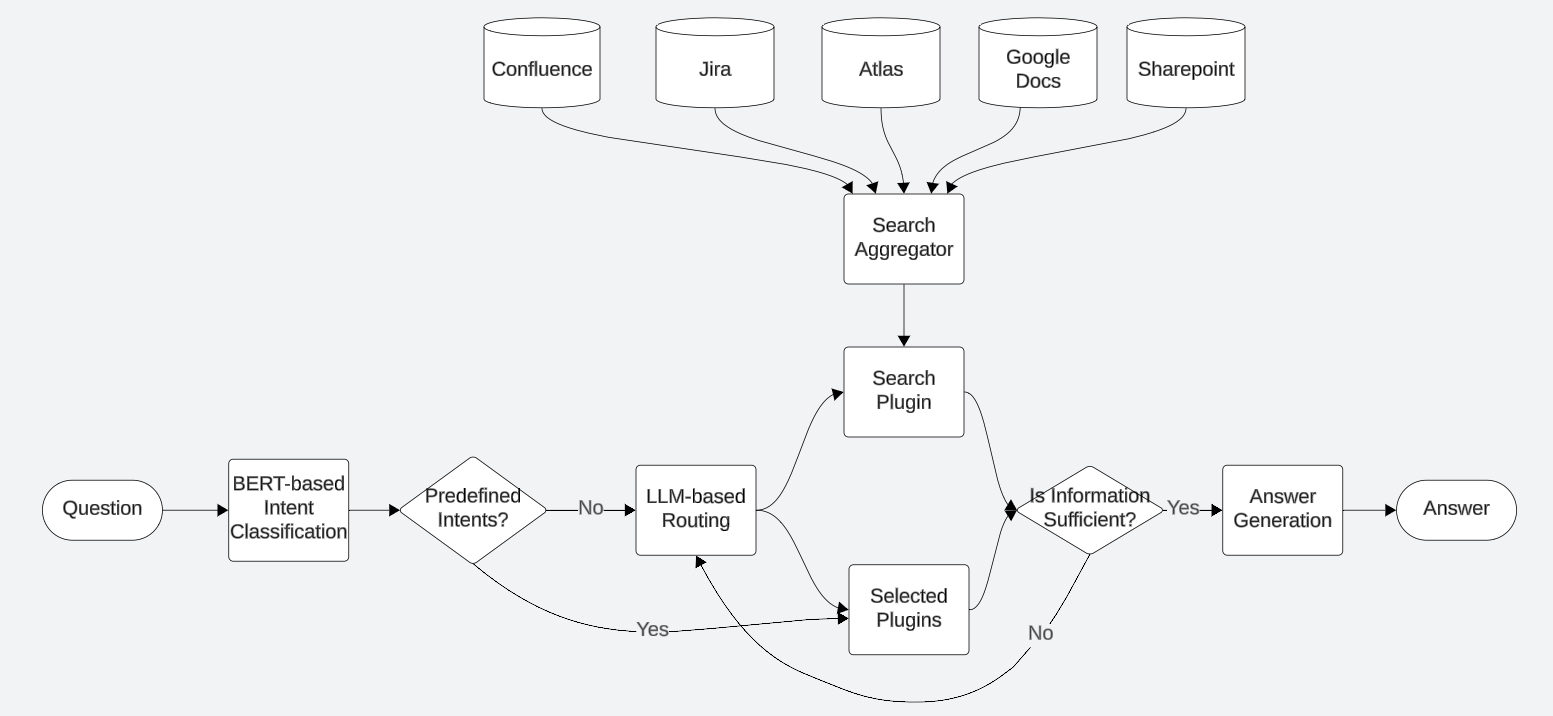 Enterprise data is stored in diverse locations in both structured and unstructured forms (e.g., relational database, search index, key value stores) across products and services such as Jira, Confluence, Atlas, Google Docs, Sharepoint, Slack, User Profile Service, Teamwork Graph, etc. To answer a user’s question, it often requires Rovo Chat to look up several places to decide whether a user’s question can be answered. LLM models often pick one data source and try to answer based on incomplete or irrelevant information in a naive RAG.