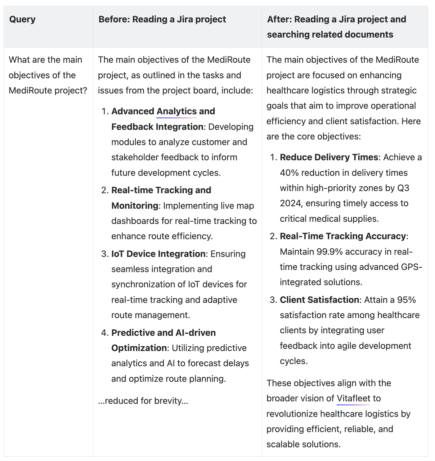 Here is an example showing the benefit of multiple plugin routing for Rovo chat. By applying multiple plugin routing, Rovo Chat summarize the project’s core objectives instead of detailed enumeration of Jira tasks.