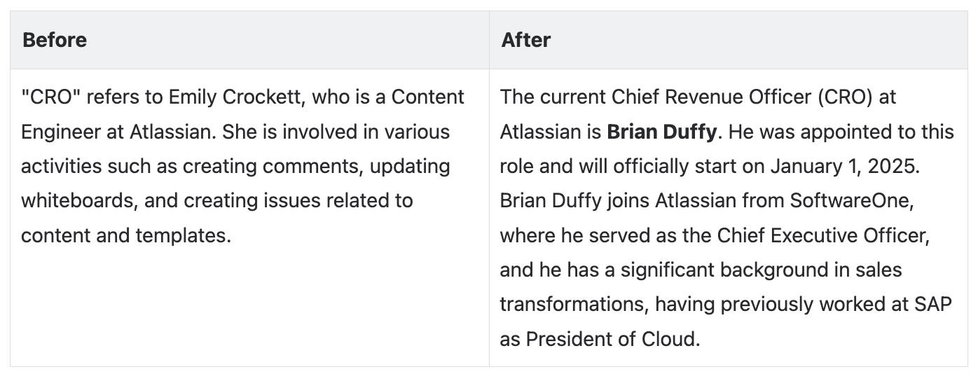 Here’s an illustrative example of Rovo Chat’s response to the question “who is CRO” before and after the plugin helpfulness check.