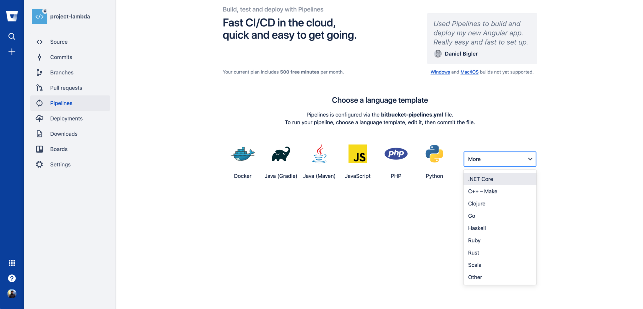 Teams new to CI/CD or familiar with setting up their own CI servers will appreciate how easy it is to get started with Pipelines. It’s a 2-step process to configure a pipeline and there’s a number of templates for languages available to get started. And because Pipelines is a cloud-native CI/CD tool you never have to worry about provisioning or managing physical infrastructure, meaning more time focusing on other priorities.