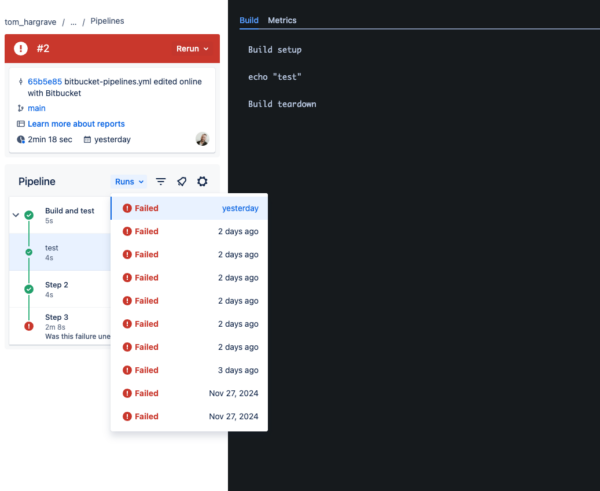 We are excited to announce the release of a new capability in Bitbucket Pipelines that will improve your experience diagnosing issues with your pipeline runs, by allowing you to view and access previous runs within the Pipelines UI.