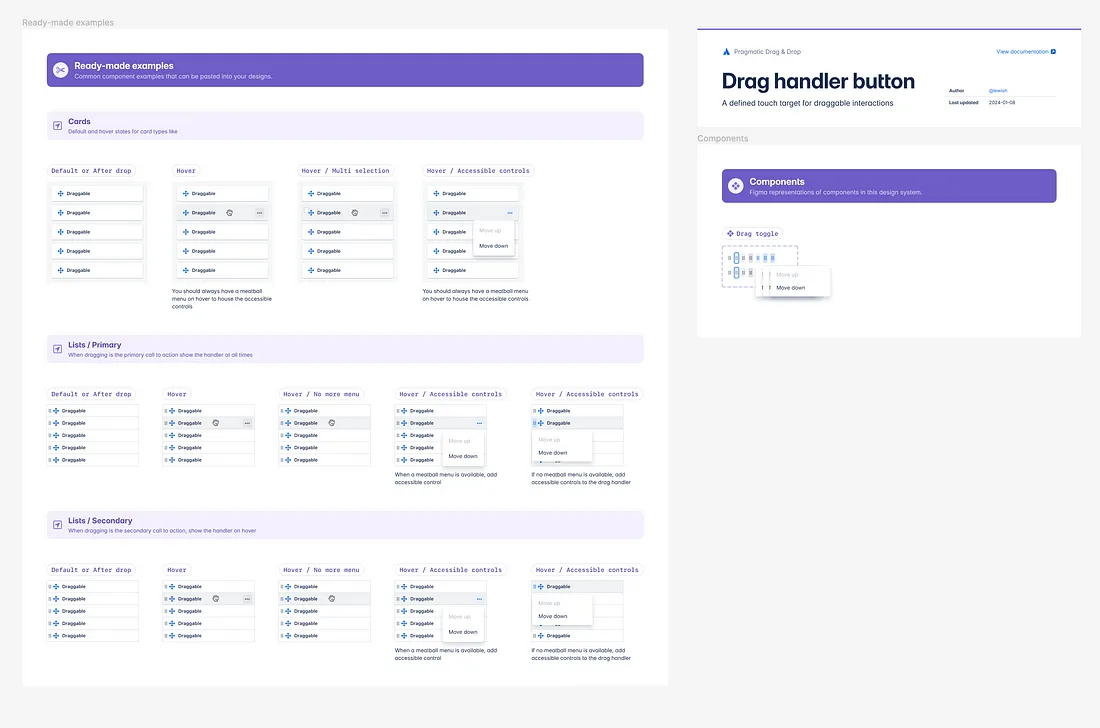 In order to help promote consistency in what we design and what we ship to our users, we created Pragmatic drag and drop tooling for Figma. Having Figma tooling enables our designers and engineers work with the same visual design language. The modular nature of Pragmatic drag and drop posed a challenge for our Figma outputs, so we focused on simplicity over fidelity. We knew it would be challenging to create a rich drag and drop prototype in Figma that would just ‘work’ — instead, we broke the components down into each part and state of the drag process. We also recorded Looms to provide guidance on how to show the different stages of a drag experience.