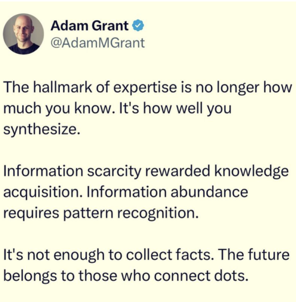 As Adam Grant recently said, “The hallmark of expertise is no longer how much you know. It’s how well you synthesize.” In an age of information overload, the ability to recognize patterns and connect the dots is far more critical than just accumulating facts. The future of design will demand this deeper understanding—knowing how to ask the right questions, combine qualitative insights with quantitative data, and refine our instincts to thrive in an ever-evolving landscape.
