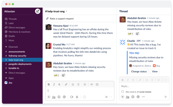 1. Turn Teams or Slack messages into tickets. The IT team also linked up a dedicated Slack channel to a service project. Using drag-and-drop automation in Jira Service Management, Slack requests automatically turn into service tickets. Comments on the ticket show up on the ticket and on the Slack thread.