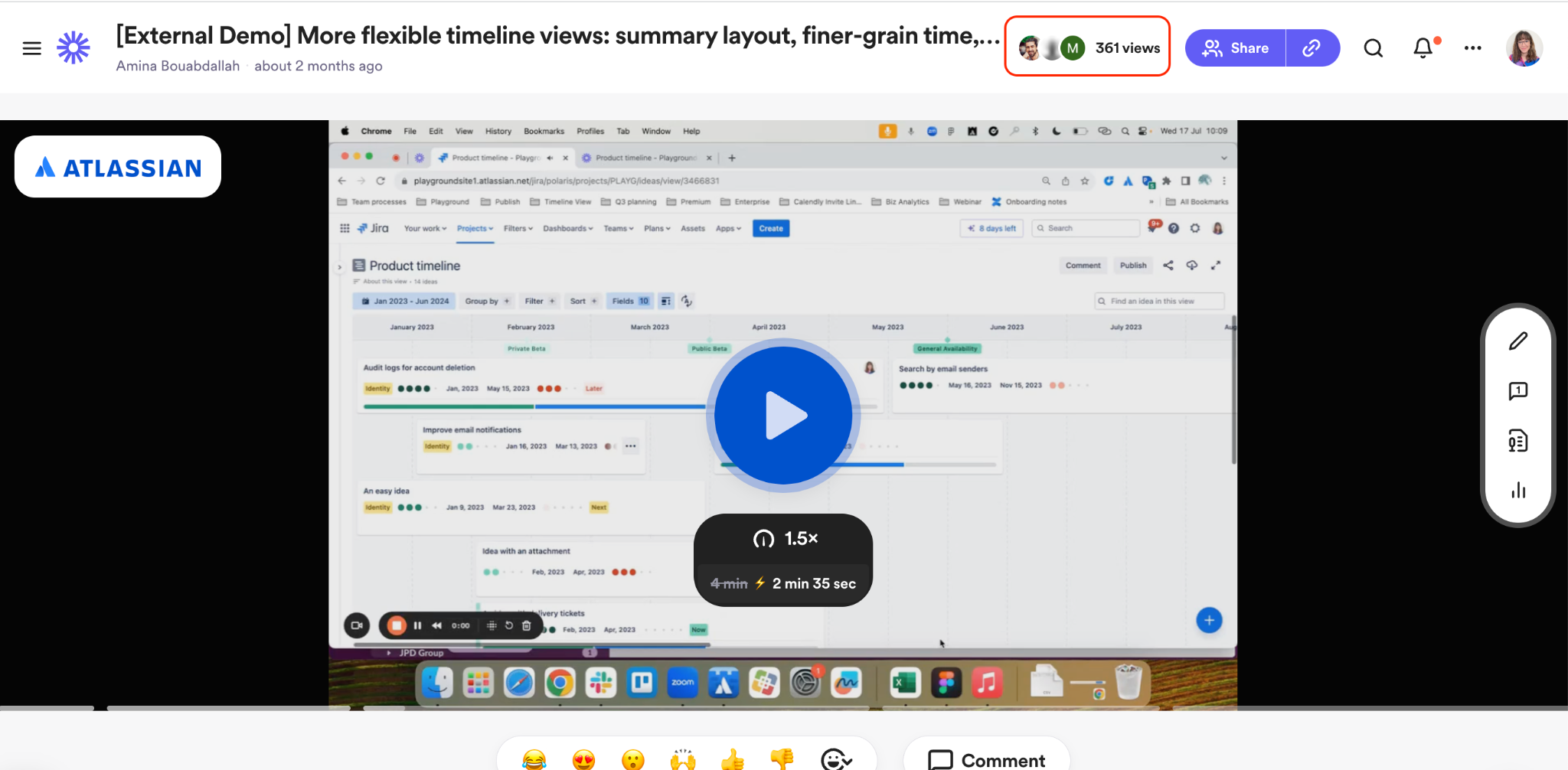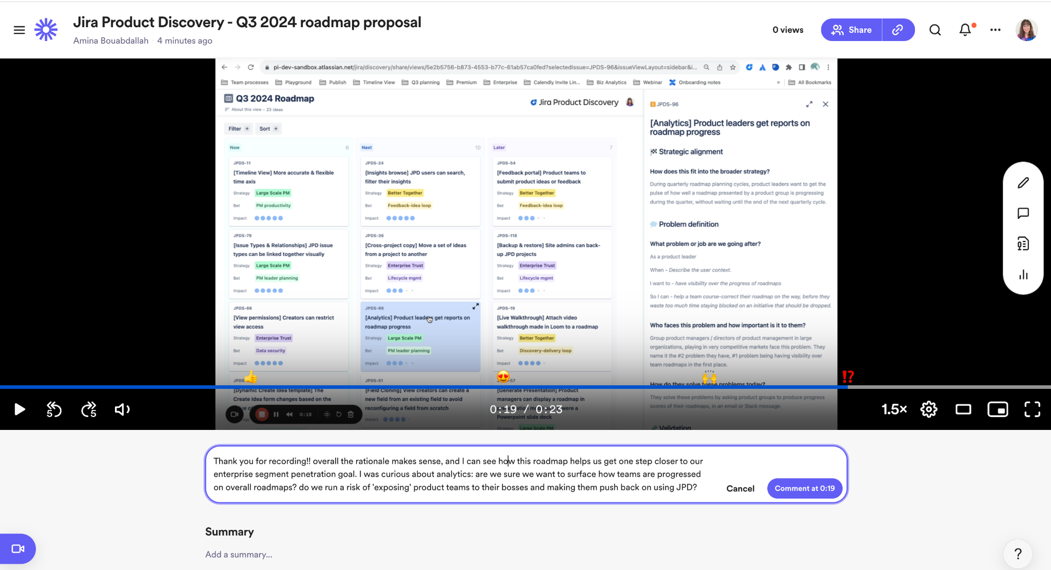 At Atlassian, once we feel confident about our roadmap, we record a Loom to collaborate with our senior leaders and get buy-in. Due to the global nature of Atlassian, asynchronous communication is key to expediting collaboration, and Loom handles this perfectly.