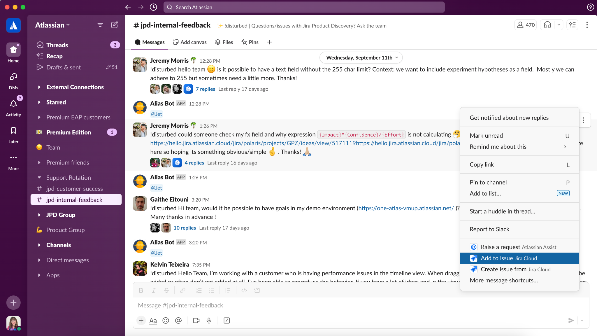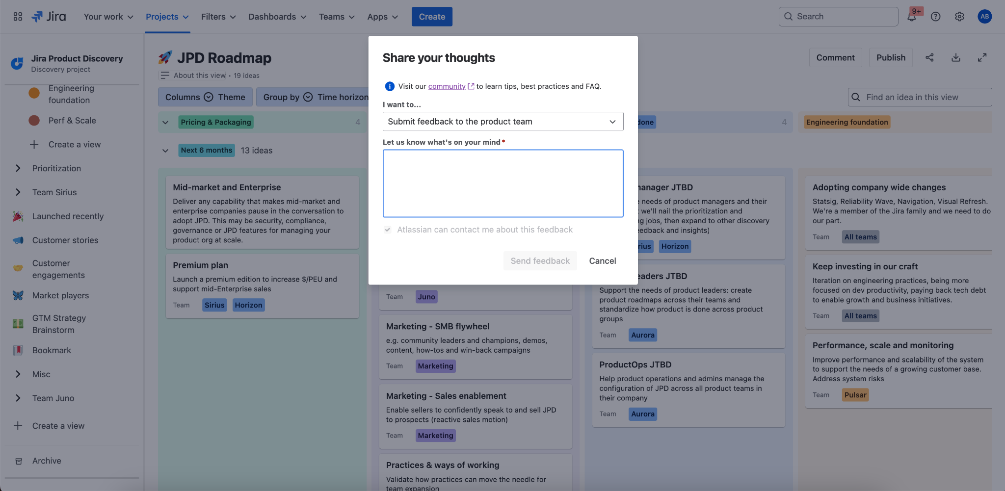 Through Jira Product Discovery, customers can easily share feedback regularly through the “share your thoughts” pop-up feature, which is received directly by the product team. On Slack, Atlassian customer representatives are always standing by to respond to any questions or concerns from users in sales, support, marketing, and beyond.