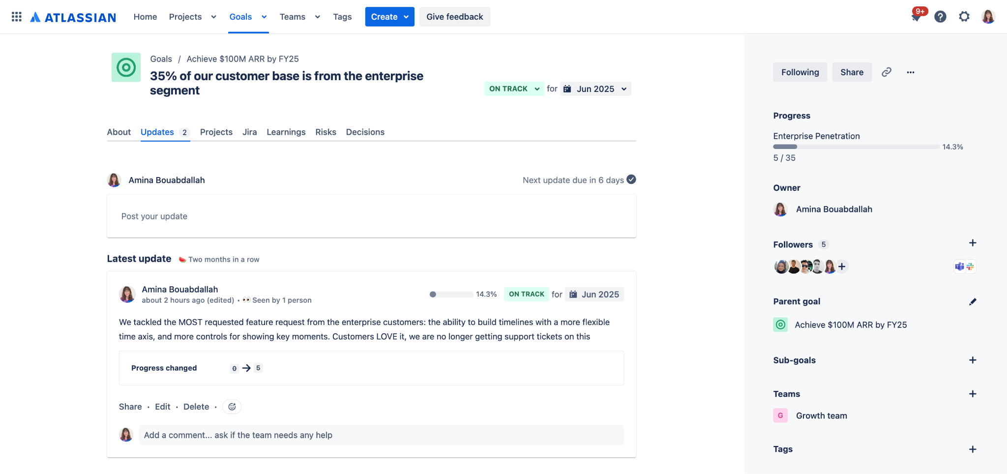 At Atlassian, we utilize Goals in Jira. This feature allows leaders to take their primary business objectives and break them down into manageable subgoals.