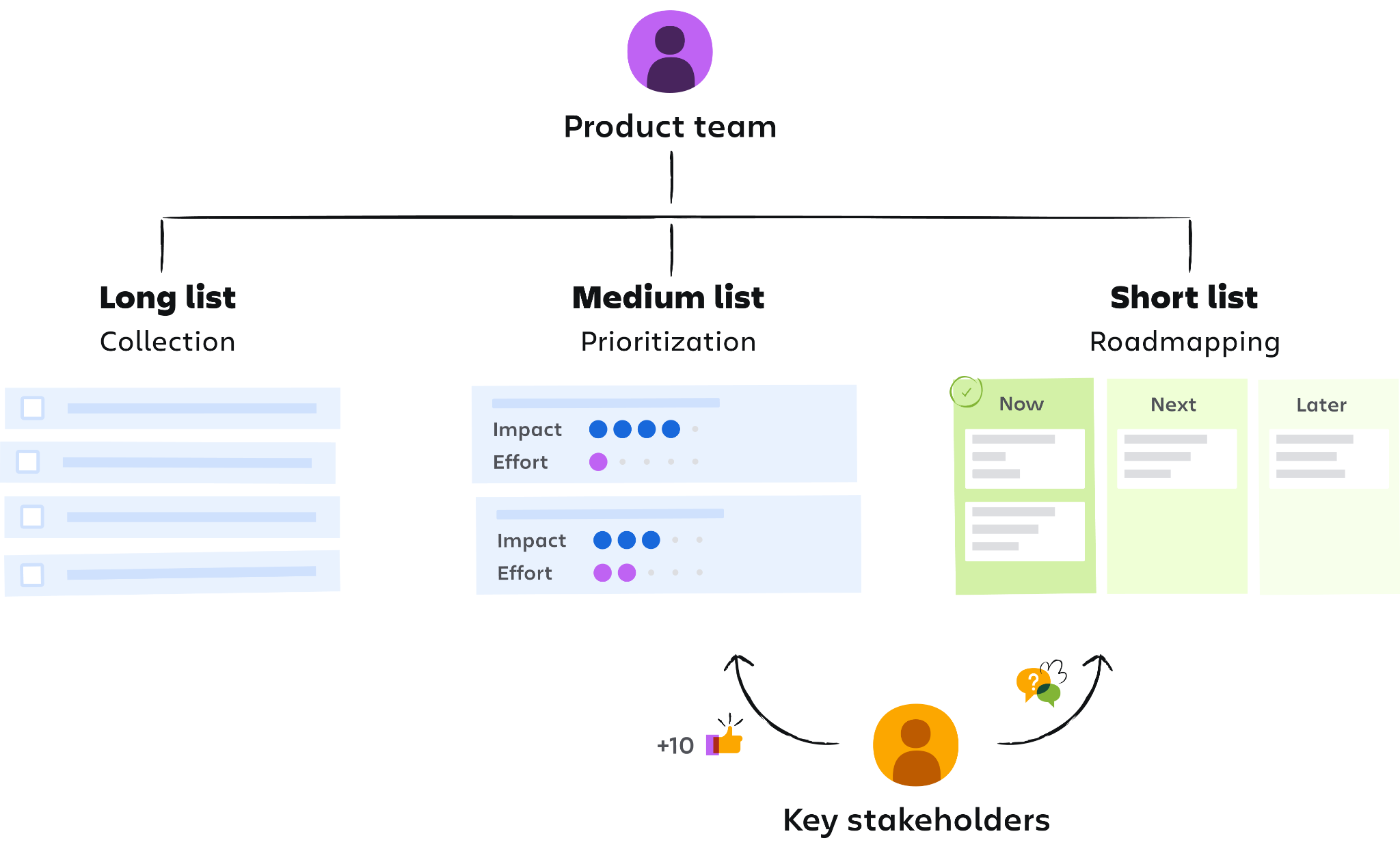 By tuning into your customers you link pieces of evidence to an idea. Now comes the process of shaping and prioritizing your offering. At Atlassian, we collect, prioritize, and roadmap, using the following process.