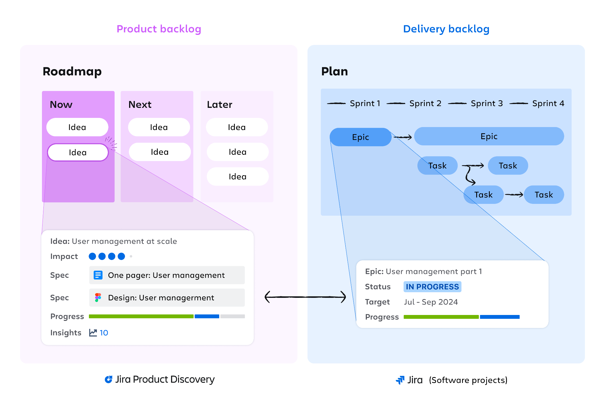 - Jira for tracking engineering work connected to the roadmap in Jira Product Discovery