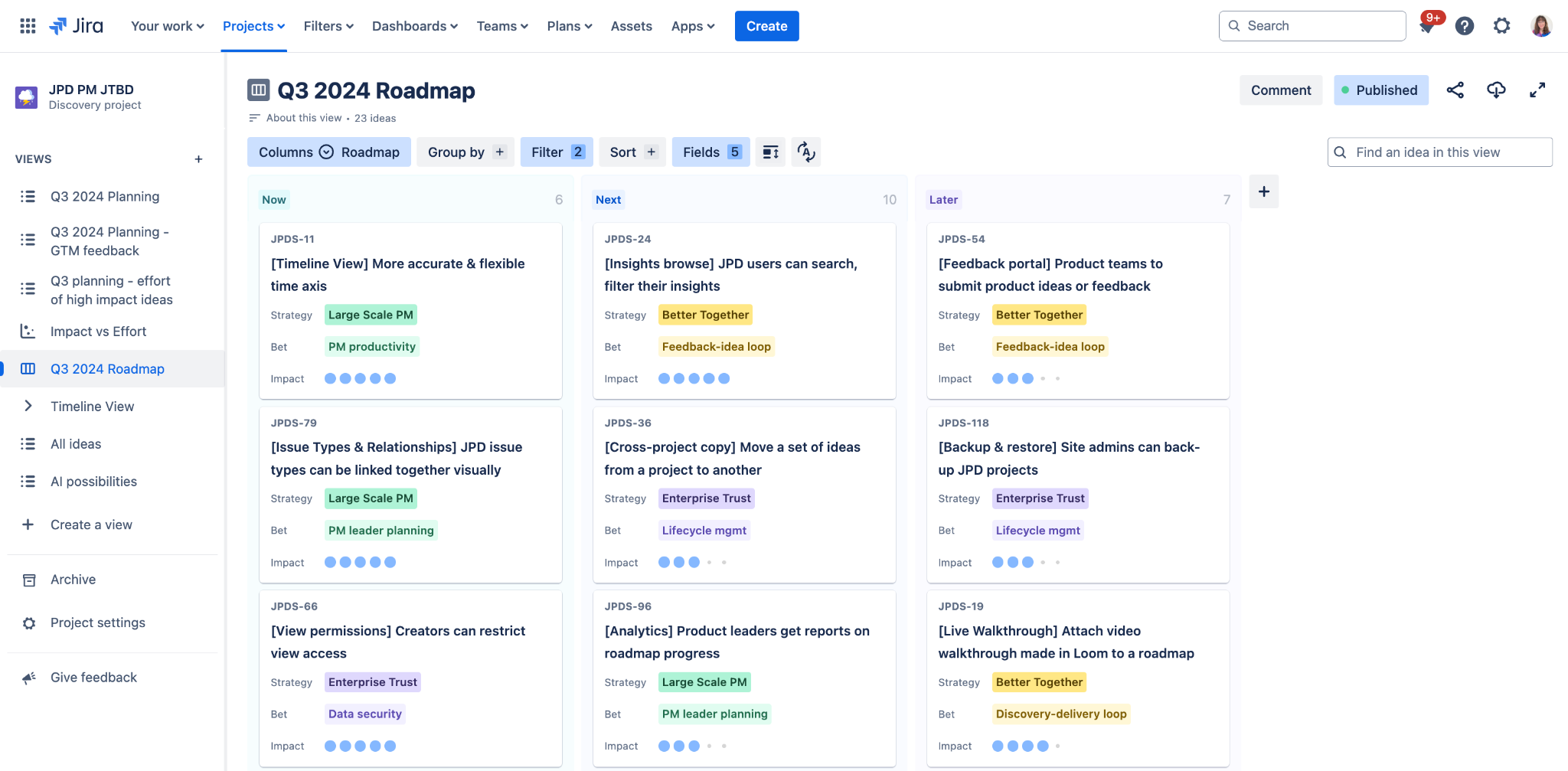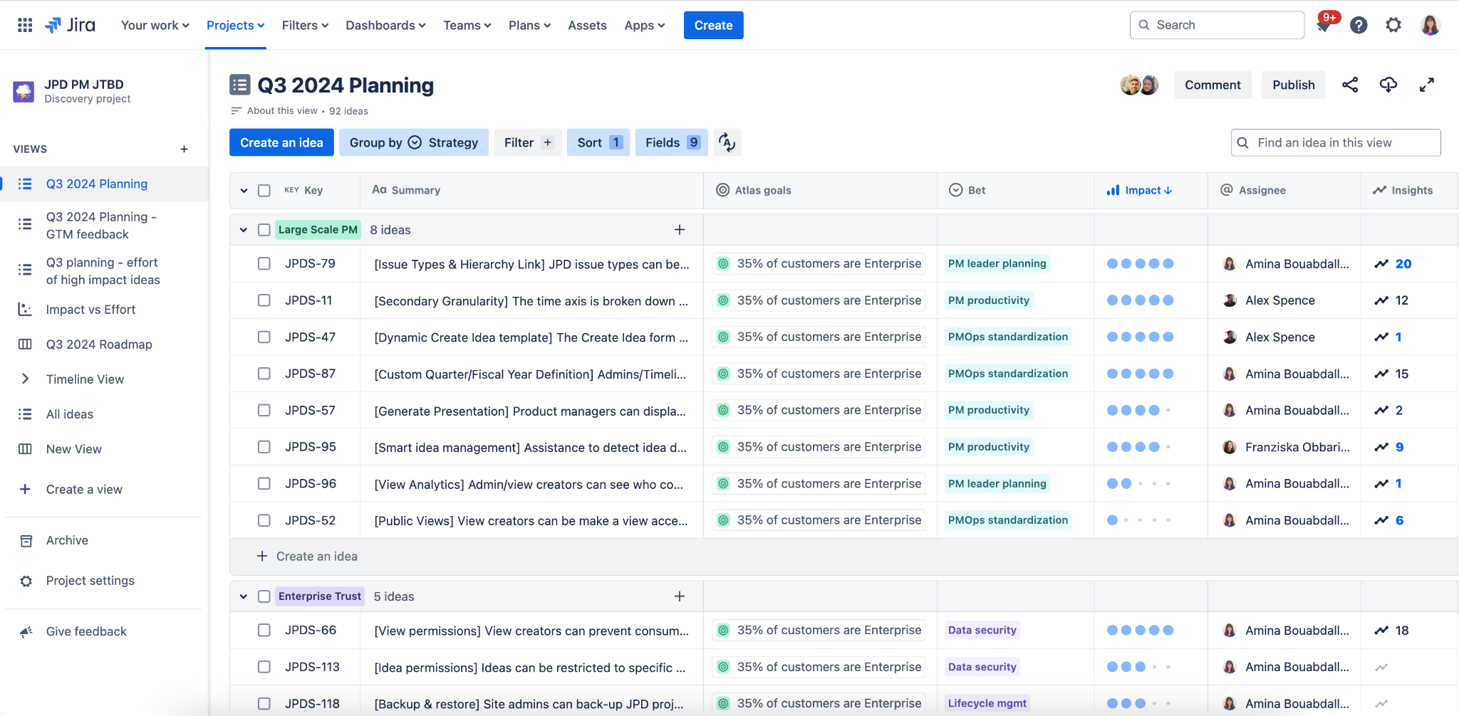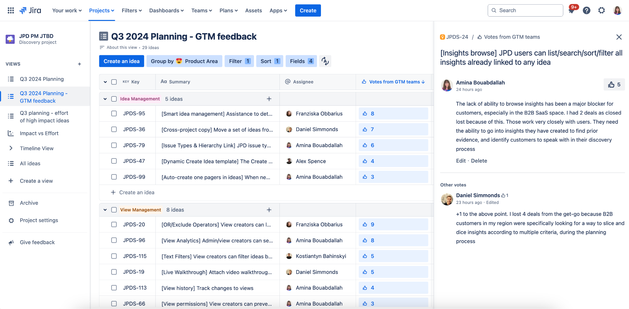 By using Jira Product Discovery while maintaining a clear line of communication with customer-facing teams, we can filter, rank, and tie-break ideas so that it is easier to differentiate between medium and high-impact ones. It’s crucial for product managers to continuously engage with these customer-facing teams, not just to close deals on the products, but to maintain partnerships to keep us in the loop with their honest feedback.