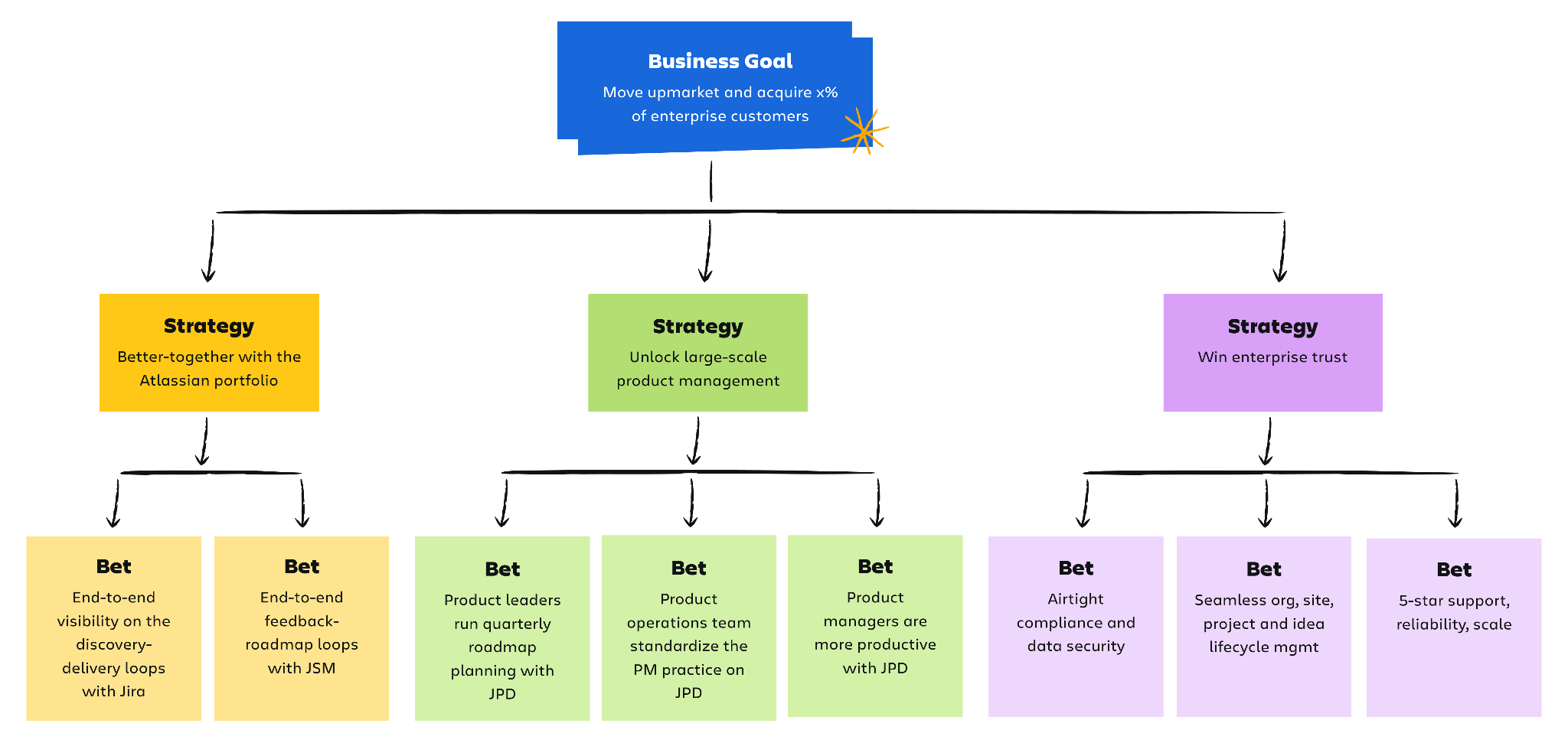 Our product organization then takes these strategies and parses them into bets. These bets are actionable decisions that align directly with the overall goal and offer more specific guidance.