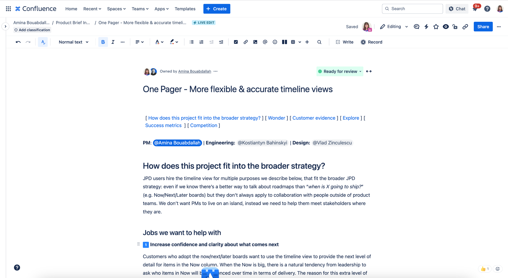 - Confluence for a deeper exploration of problems and for clarifying ideas through PRDs
