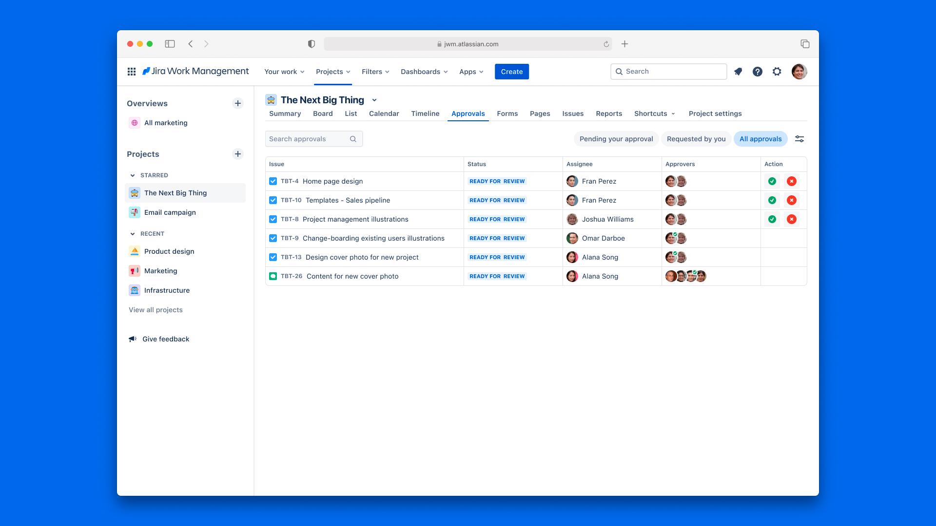 Surveying the lay of the project should be as predictable as a romantic comedy. Project managers crave a simple way to gain an overview of their project, collaborate with others, and easily dive into the details where needed. With Jira Work Management, those carefully crafted overviews are built directly into your first view with the Summary page. Get essential details on your projects without drowning in the details. And, simply add multiple projects to see the same info across a wider picture of teams and tasks. No need for complex dashboard configurations.