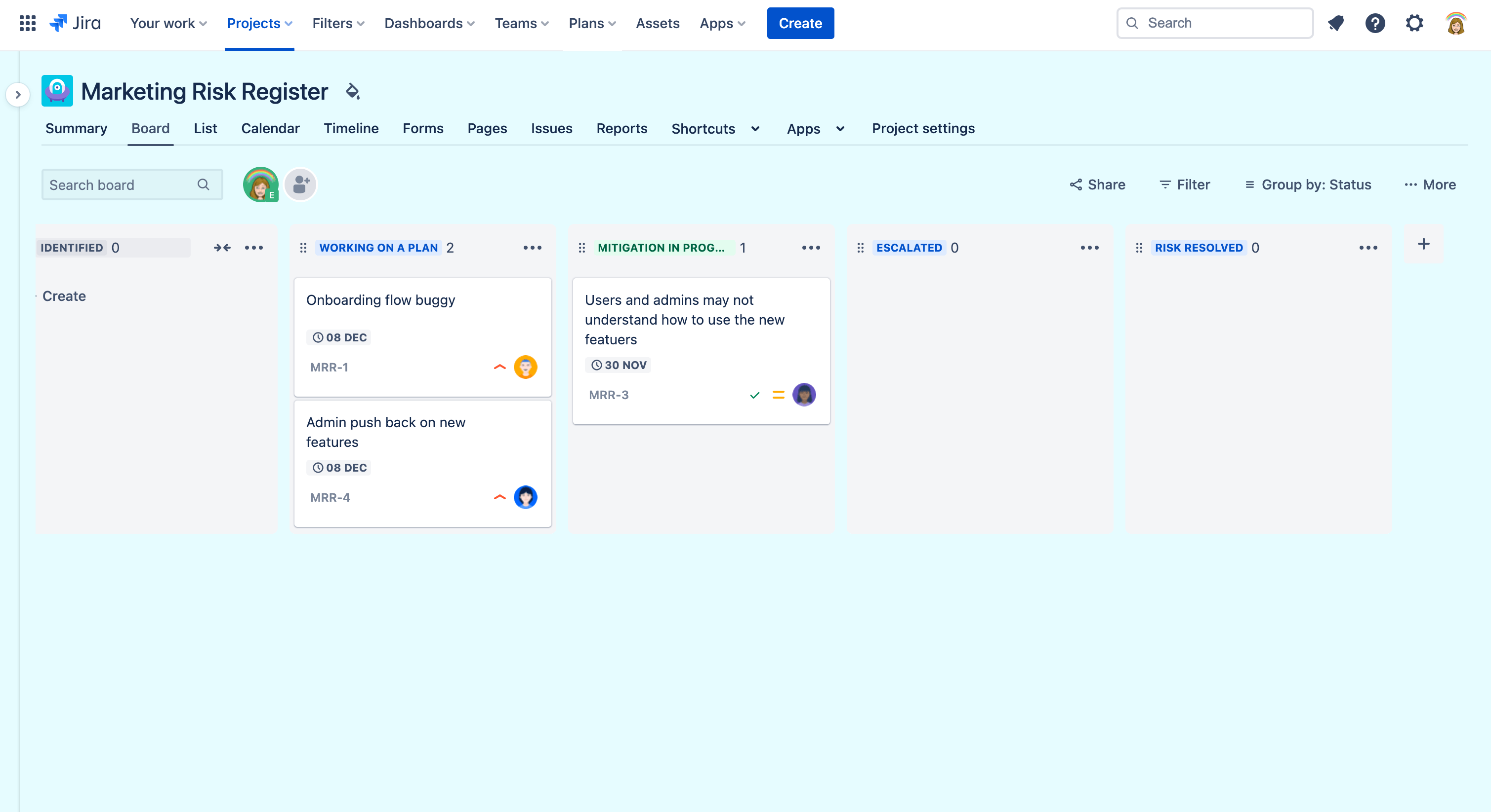 Tackle project risks head-on by thinking how to mitigate them from the start. Once you go through a brainstorming activity with your team to think about “What could go wrong”, and “What lessons have we learned from our past projects”, add them to a risk specific board in Jira Work Management. Creating tickets and assigning them to owners allows you to stay on top of the risks and see how they are progressing every week.