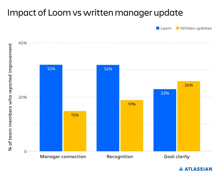 Loom updates led to much higher improvements in manager connection and recognition than written updates. In fact, people whose managers used Loom to share information were twice as likely to feel more connected to their manager. This makes sense: a video in which you can see someone’s facial expressions and body language is a much more personal form of communication.