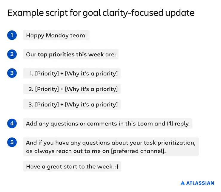 - Film a Loom of yourself. Consider adding a written note clearly listing out the three priorities and why each matters as a reference for your team throughout the week.