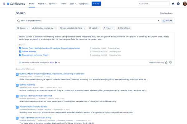 See it in practice: Atlassian enables seamless real-time collaboration through cross-tool integration. Teams can search across Atlassian products like Confluence and Jira, as well as third-party tools like Google Drive, SharePoint, and Figma, so all relevant information is readily available to support their work.