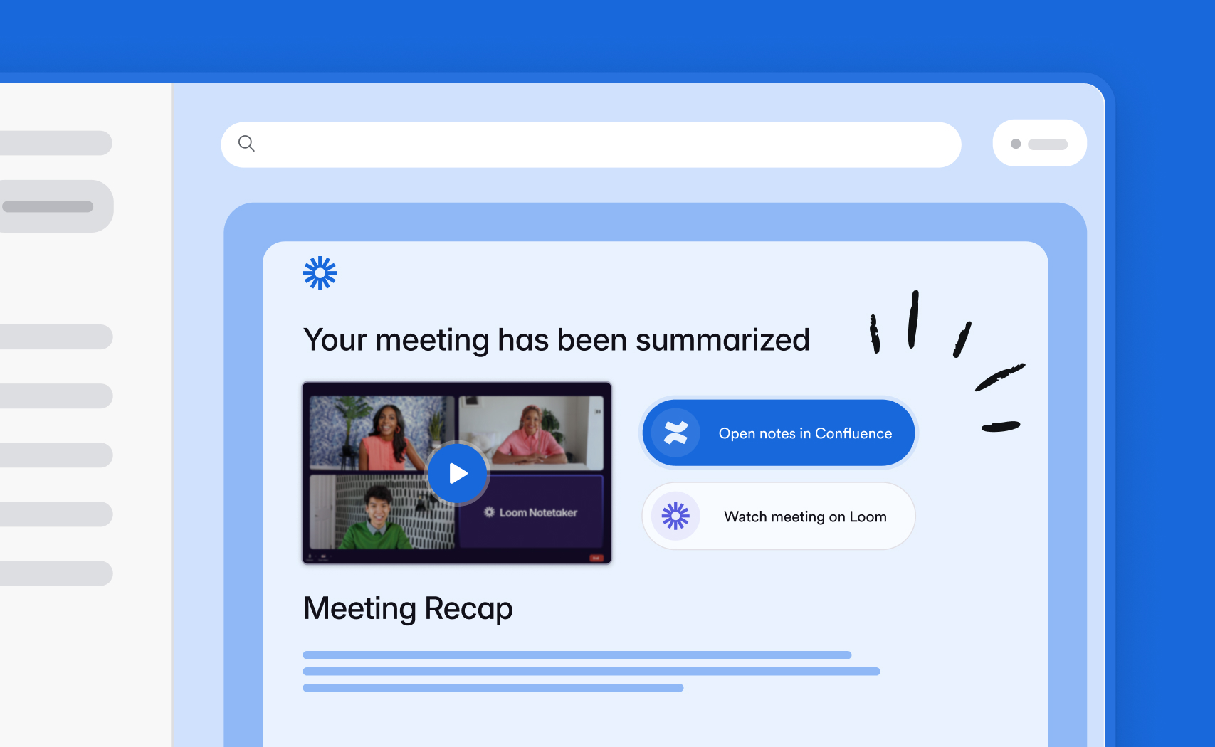 Loom exists to make your working life easier. Cue our new AI-powered note-taker: designed to simplify how your team captures and shares information from meetings. Instead of scrambling to take notes or relying on memory, this time- (and team-)saving functionality captures the meeting content and generates an organized summary in Confluence. You get a clear recap, complete with meeting attendees, assigned action items, timestamped highlights, and a full transcript – even if you couldn’t attend.